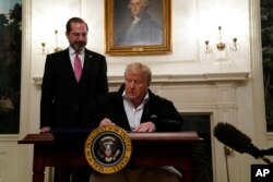 美國總統特朗普在白宮簽署緊急抗疫撥款法案時,衛生部長阿扎爾站在特朗普身後。(2020年3月6日)