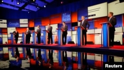 民調支持率居於首位的共和黨總統參選人川普(Donald Trump)沒有參加這場由福克斯新聞網主持的辯論會。參加辯論會的參選人們對此發表簡短評論後,就避免再提及川普,集中闡述自己在重大問題上的立場。