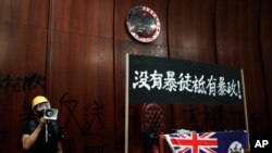 大批示威者戴上頭盔﹐手持自製盾牌在星期一晚已經衝入香港立法會議事廳﹐並且破壞不同設施。據CNN有線電視新聞網的報導說﹐在場的示威者投票通過於午夜撤離立 法會。