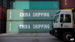 資料照:在喬治亞州薩瓦納港,一輛卡車駛過中國海運集團的集裝箱。(2018年7月5日)