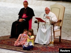 天主教教宗方濟各在梵蒂岡。有兒童在他前面自拍(2016年6月11日)