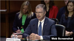 資料照片:被提名為主管東亞及太平洋事務的助理國務卿的康達2021年6月15日出席參議院外交關係委員會有關他的人事提名確認聽證會。(參議院外委會聽證會直播網絡視頻截圖)