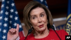眾議院議長南希·佩洛西在彈劾調查公開聽證會後第二天早晨對媒體講話。(2019年11月14日)