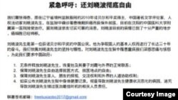 多名零八憲章聯署人、知名人士周二發出緊急呼籲,要求無條件釋放劉曉波,恢復劉曉波及其妻子劉霞與外界的正常聯繫,保障其自由選擇就醫方式、就醫地點的自由。