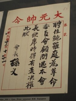 共產國際駐中國代表鮑羅廷曾參與改組國民黨。中國宋慶齡基金會與俄羅斯方面2011年在莫斯科聯合舉辦介紹宋慶齡和孫中山的展覽。展覽中展出了孫中山1924年簽字的鮑羅廷任命狀。(美國之音白樺拍攝)