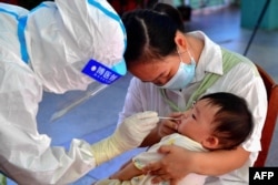 中國福建省莆田仙遊縣的一名幼兒接受新冠核酸檢測。(2021年9月13日)