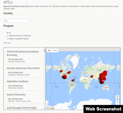 ACT在中國的考點全部是這些經過特許認證的機構,提供培訓和考試一條龍服務。對於中國考生而言,如果不上這些學校的培訓課程,就需要自行出國考試。而如果在這些培訓機構報名上課,就可以在同一個地方考試,監考老師也是這些培訓機構的僱員,而非ACT的員工。