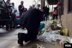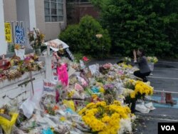 在他面前,花束、花圈、蠟燭和寫著反對種族主義口號的海報擺滿地面。不到兩週之前,華裔移民譚小潔在此處自己經營的按摩店里和其他三人一同被槍殺。