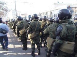 2012年3月莫斯科市中心反政府示威時,捷爾任斯基師士兵。(美國之音白樺拍攝)
