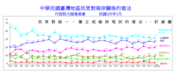 兩岸互動方面,陸委會民調顯示有6成民眾贊成“兩岸既有的經貿、文教等交流活動不應受兩岸情勢變化影響”(60.3%)。有超過7成者支持兩岸協議監督條例應該符合中華民國憲法規定,且需務實可行(75.3%)。