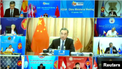 中國外長王毅2020年9月9日通過視頻出席東南亞聯盟年度外長會議(路透社轉發視頻截圖)