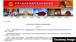 中國駐印度大使館2020年10月27日發聲明指責蓬佩奧訪印時發表反華言論