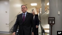 參議院外交關係委員會的民主黨籍資深議員鮑勃·梅嫩德斯走向他的辦公室(2018年2月14日)