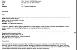 美國國務院最近公佈前美國國務卿希拉里·克林頓在2009年3月到12月期間從私人電郵地址發出的大約3000頁電子郵件。電郵涉及美國和中國就區域問題的合作,人權組織對國務院在六四20週年所發表聲明的感謝,以及克林頓對北京人民大會堂所鋪設地毯的喜愛等等。