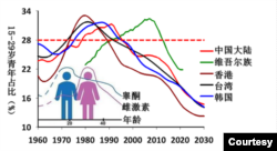 台灣和南韓的青年比例從1966年的25%上升到1980年代初的32%、31%的高峰。居民可支配收入佔GDP的65%以上,民間力量活躍。經濟高速增長,民主熱情高漲,民運、學運此起彼伏,兩地在1987年完成政治轉型,中位年齡只有25歲、26歲。