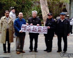 山東大學退休教授孫文廣(中)和朋友們在公園拉開橫幅悼念趙紫陽